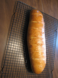 Move the formed dough onto a parchment-covered baking sheet. Allow it to rise for one hour. Preheat the oven to 425 degrees. With a very sharp blade, carefully cut 5-7 slashes along the top of the loaf. Be careful to not compress the dough. Brush the loaf with the egg wash and then allow the dough to rise for a few more minutes while the oven heats. Bake for 20 to 25 minutes, or until it has the golden color and hollow sound. Allow to cool before slicing. Add some cheese and imagine you're in France. Manure pile optional.